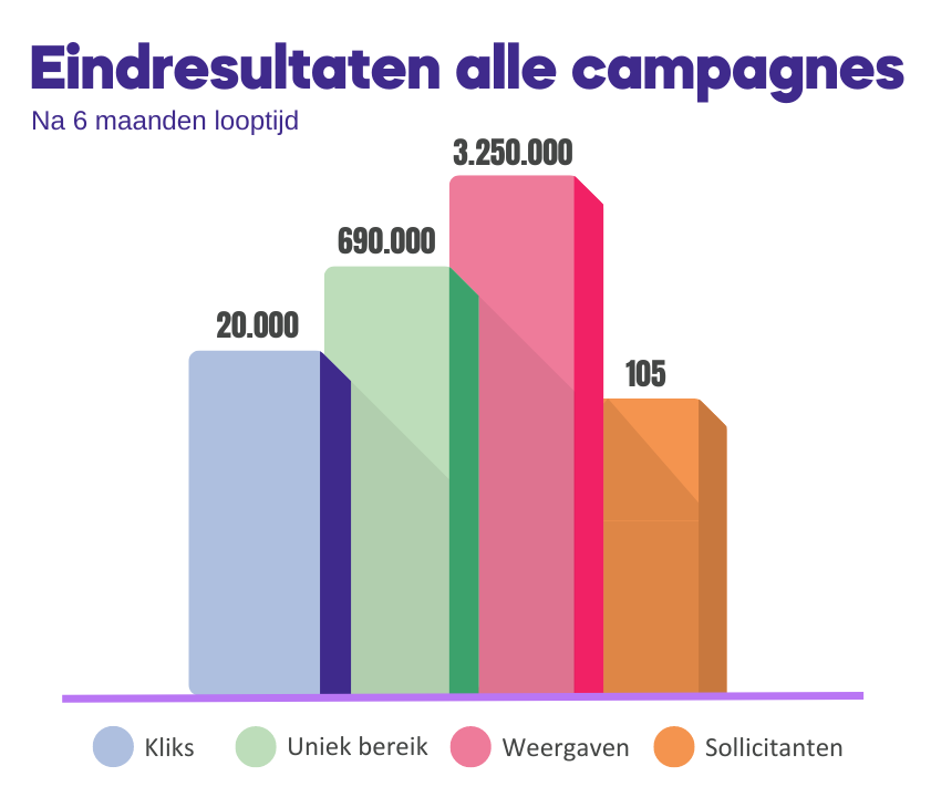 Deze EVP boodschap vormt de basis voor de Recruitment Marketing campagnes. Met het doel zoveel mogelijk sollicitanten aan te trekken en vacatures in te vullen gingen we van start.
